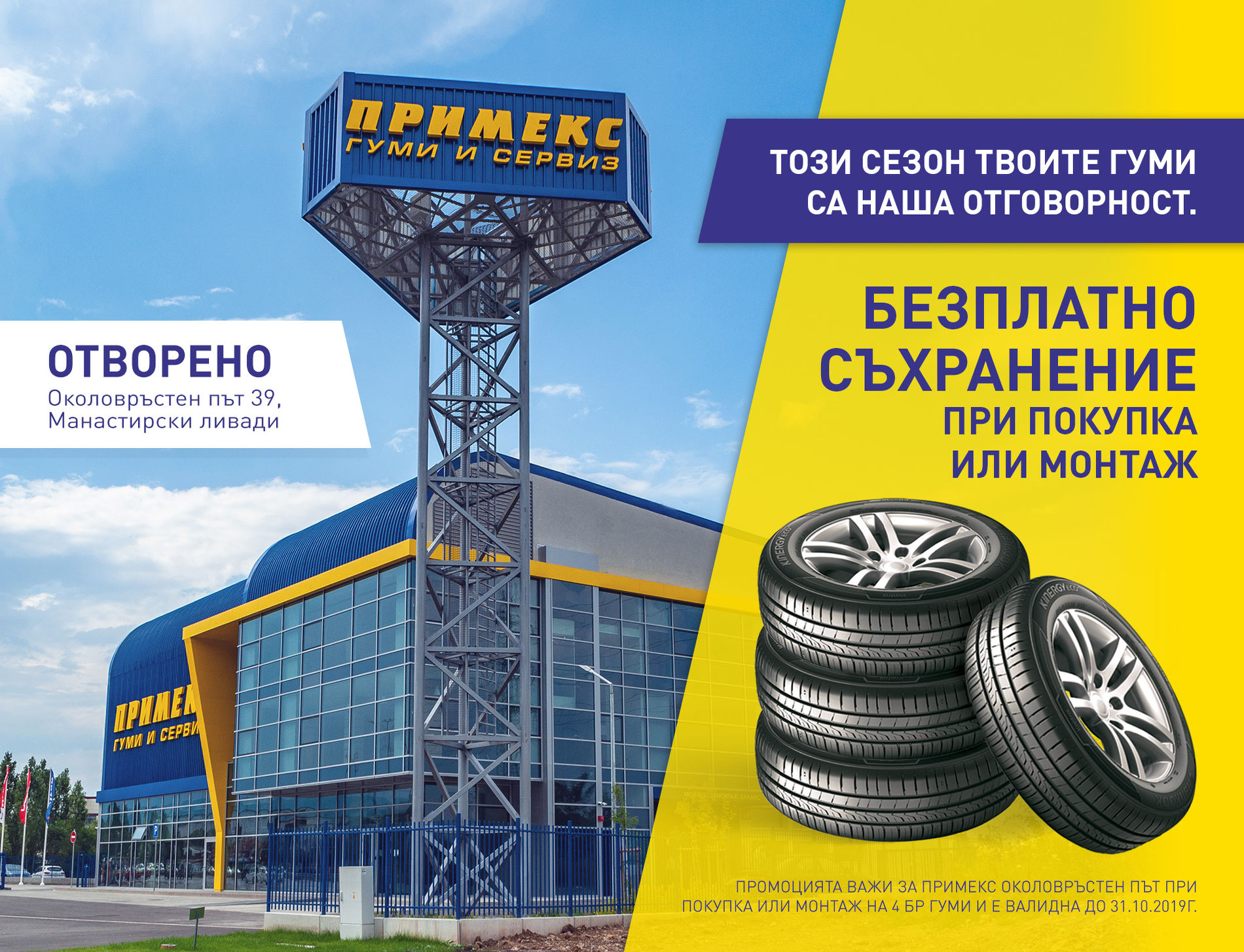 Заповядайте в новооткрития ни Примекс център на Околовръстен път 39 в София. Купете или само монтирайте на място 4 леки гуми и ще получите безплатно съхранение - “Хотел за гуми” - за един сезон. Промоцията е валидна само за крайни клиенти в периода 09.09. - 31.10.2019г. само за обект Примекс Околовръстен път.