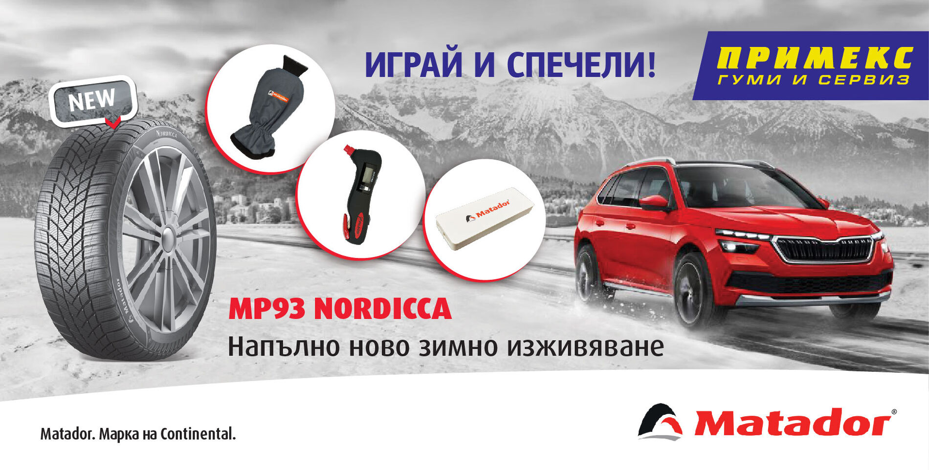 Съвместно с Радио Енерджи Ви предоставяме възможността да спечелите награди от марката Matador, собственост на компанията гигант в производството на гуми Continental Tire Group, сред които и комплект 4 зимни гуми MP93 Nordicca.