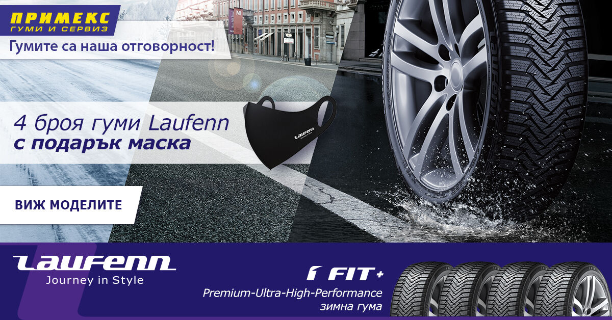 Условия на кампанията: Ако закупите 4 (четири) броя зимни гуми LAUFENN, независимо от цолажа и предназначението, получавате подарък – 1 бр. Clair-Aerosilver предпазна маска с логото на LAUFENN (до изчерпване на количествата)!