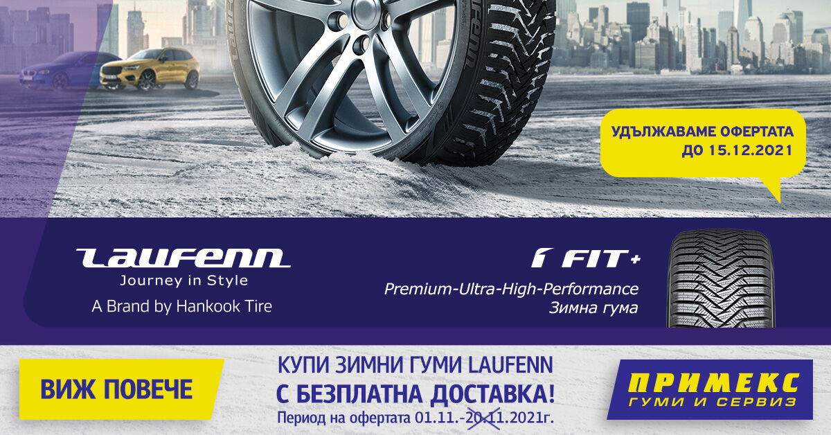 Промоцията важи за крайни клиенти при покупка онлайн или при поръчка на телефон 070010122 на зимни гуми за леки, лекотоварни автомобили и SUV и не се комбинира с други отстъпки и промоции. Промоцията не важи при покупки на гуми LAUFENN на място в обектите на ПРИМЕКС.