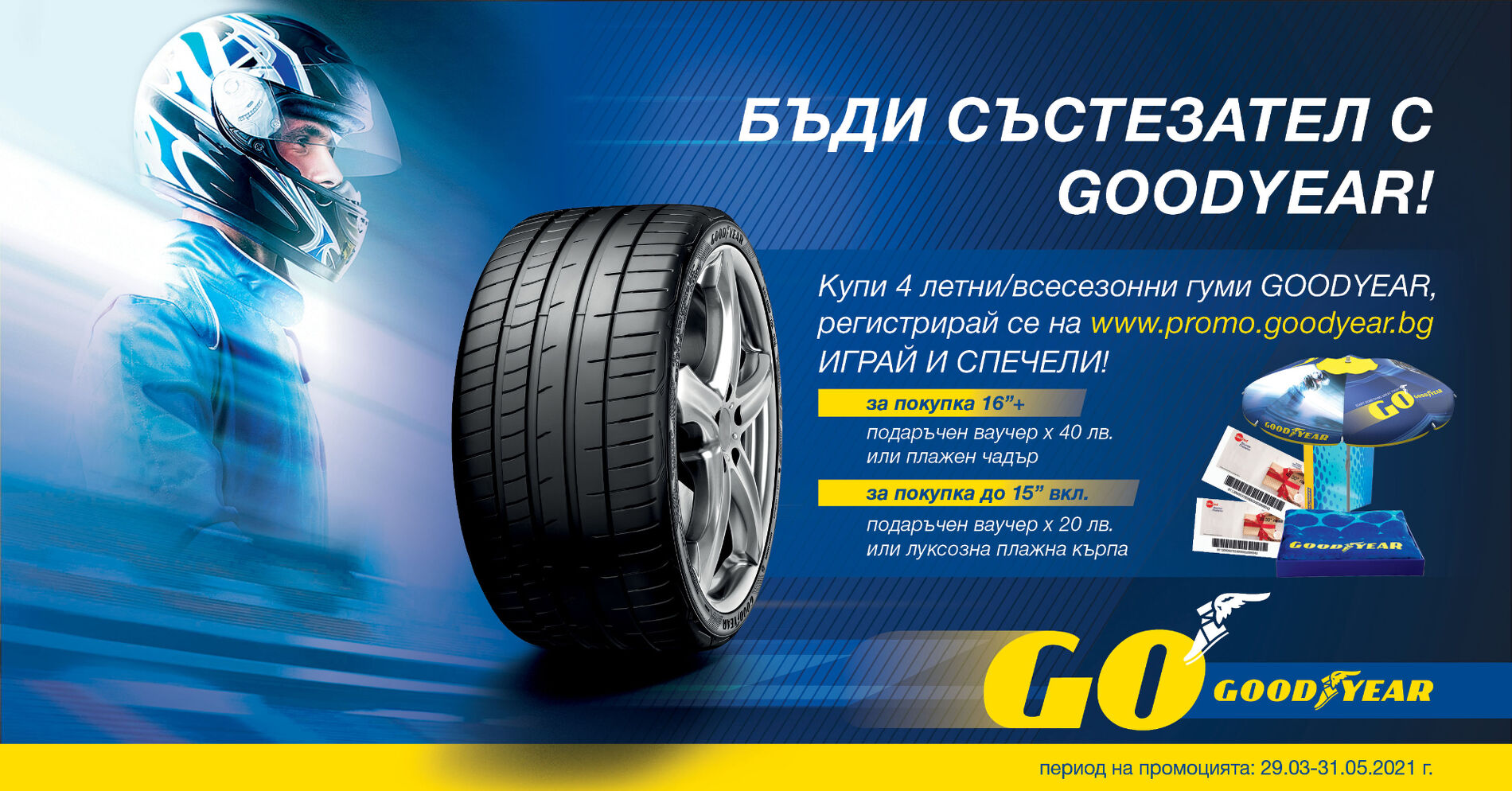 В кампанията участват всички размери летни и всесезонни гуми за леки и лекотоварни автомобили с марка Goodyear, закупени в комплект от 4 бр., като наградите са разделени в зависимост от размера на закупените гуми.