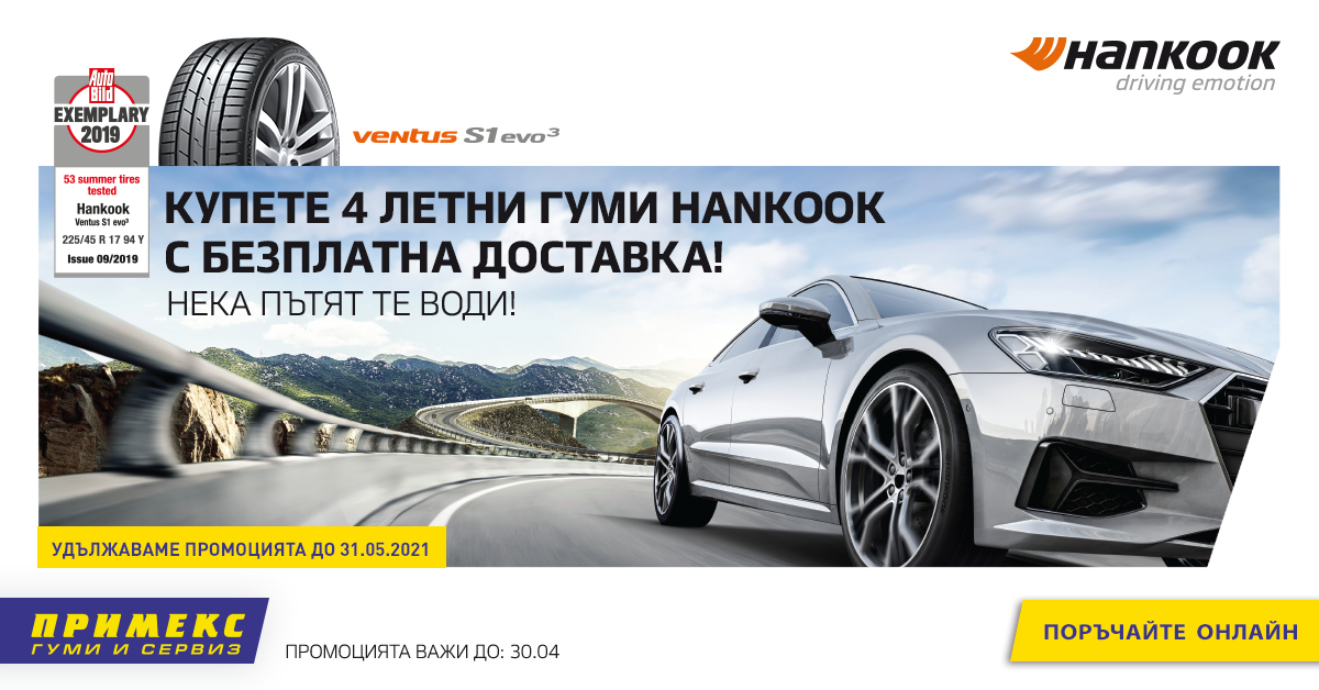 Само в периода 5 април до 30.04.2021 31.05.2021 г. всички летни гуми HANKOOK са с безплатна доставка при поръчка онлайн на www.primex-bg.com или на националния телефон 070010122.