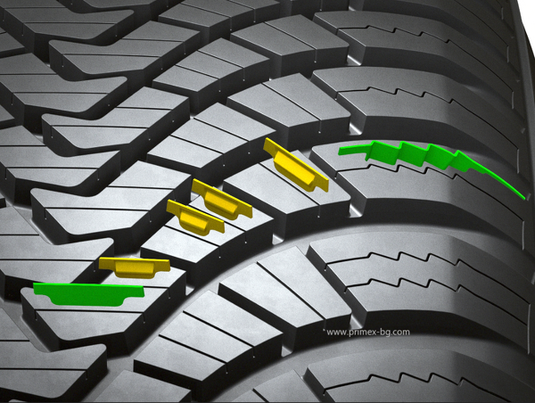 Каналите по повърхността на протектора са аранжирани под различни ъгли, за да се увеличи ефективността на гумата при всякакви климатични условия, включително при различни ъгли на завиване. Линейните 3D ламели в центъра на протектора подобряват работните характеристики, особено при заснежени пътища, без това да компрометира стабилността на блоковете при управление на сухи настилки. Допълнителните, вълнообразни ламели в областта на раменете подсилват сцеплението и спирачните характеристики при сняг, но също така могат да се затварят за приложение при сухи условия.