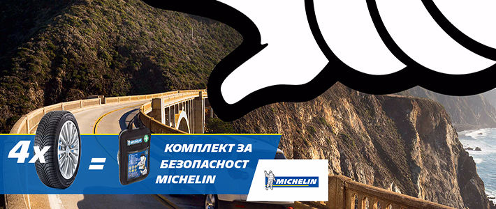 Възползвайте се от промоцията на Michelin: При покупка на 4 летни гуми Michelin, вкл. Michelin CrossClimate, получавате подарък – брандиран комплект за безопасност за автомобил. В кампанията участват гуми за леки, лекотоварни автомобили и 4 x 4.