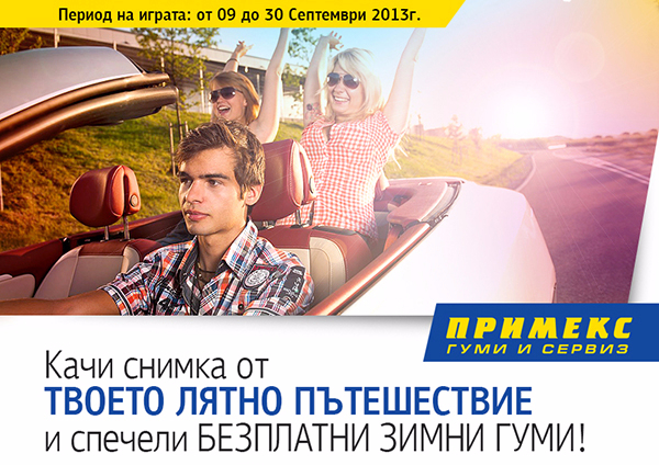 Примекс стартира Facebook игра, наречена „Моето лятно пътешествие“. Вдъхновени от приключващите летни ваканции и времето на път, феновете на страницата могат да качват най-запомнящите се снимки в специално подготвено приложение и да очакват максимален брой приятели да ги харесат, за да спечелят награда. 3 комплекта от 4 чисто нови зимни гуми на стойност до 500 лева ще спечелят участниците, събрали най-много лайкове. В края на всяка седмица на случаен принцип от феновете ще се избират по 10 късметлии, които ще получат талони за 25% отстъпка при покупка на гуми в центрове Примекс. Играта стартира днес и ще продължи до 30 септември.
