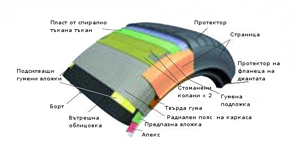 - Протектор – обезпечава сцеплението и износоустойчивостта и предпазва каркаса под него.