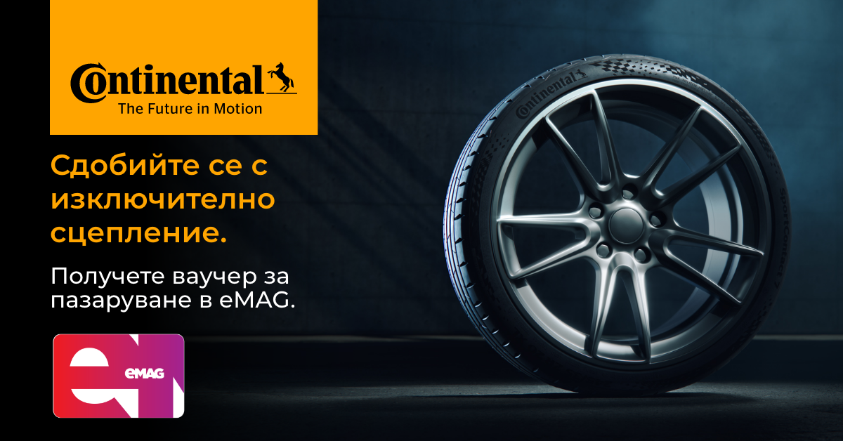 Когато закупите 4 гуми Continental до R17, включително, получавате електронен ваучер за пазаруване в eMAG на стойност 40 лева, а при покупка на 4 гуми Continental от R18 или повече, получавате електронен ваучер от 60 лева.
