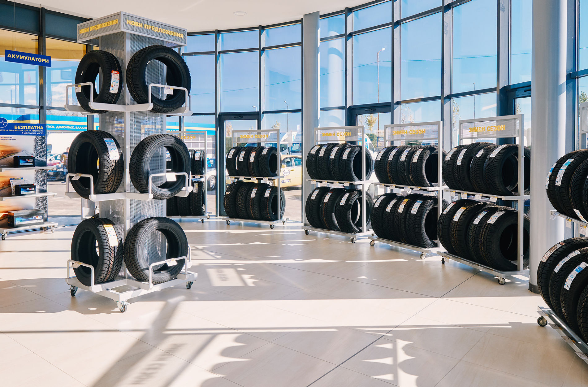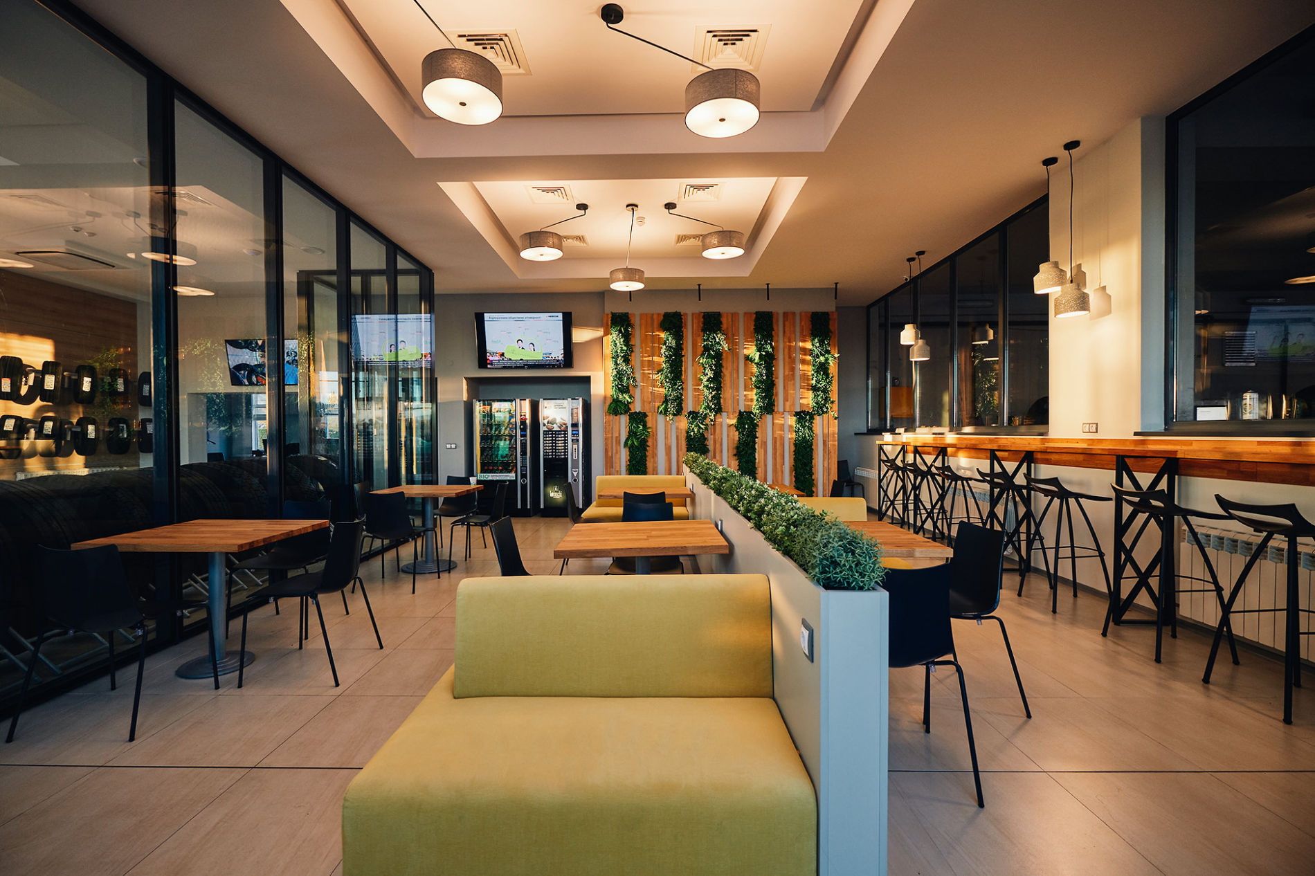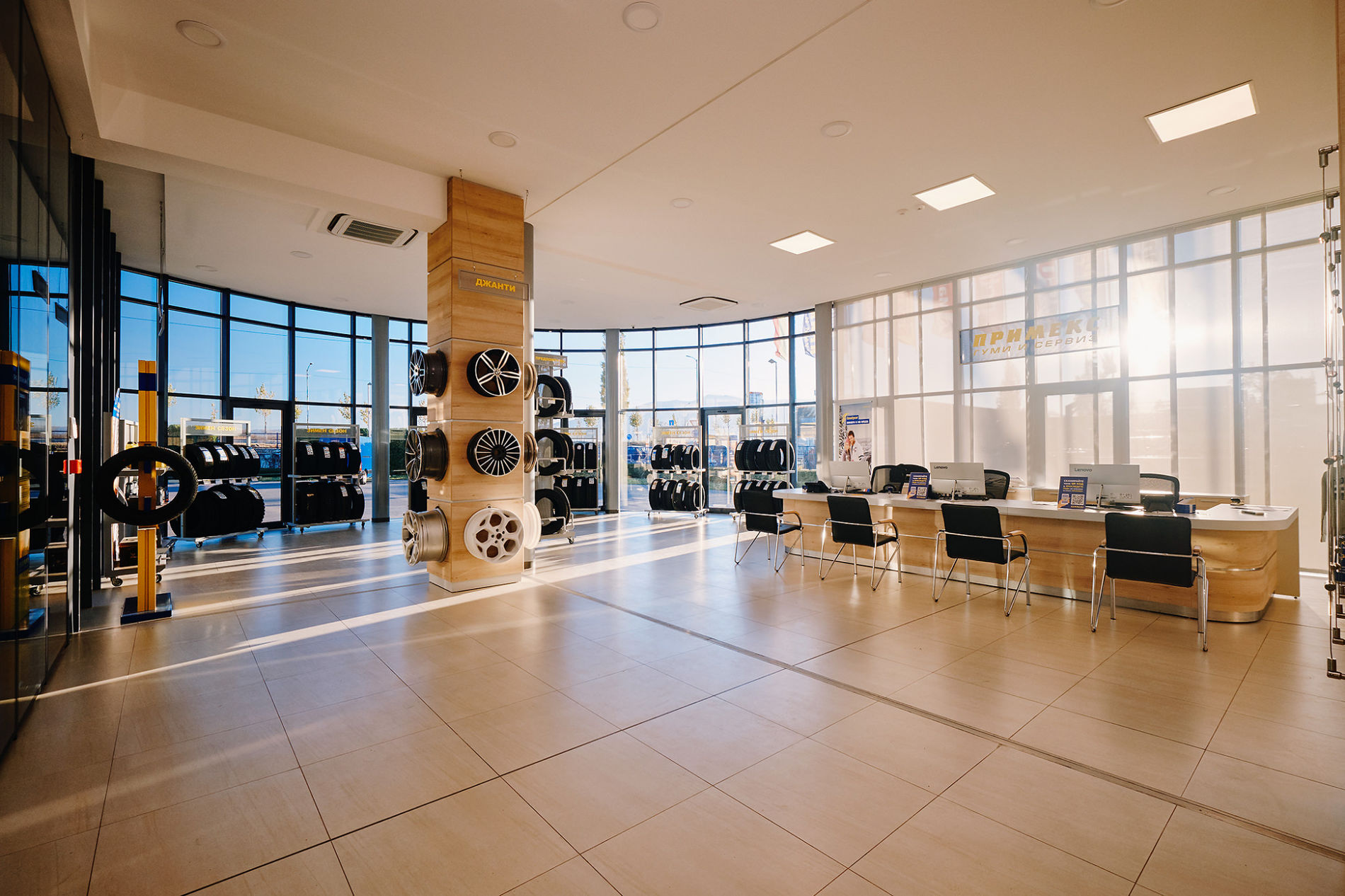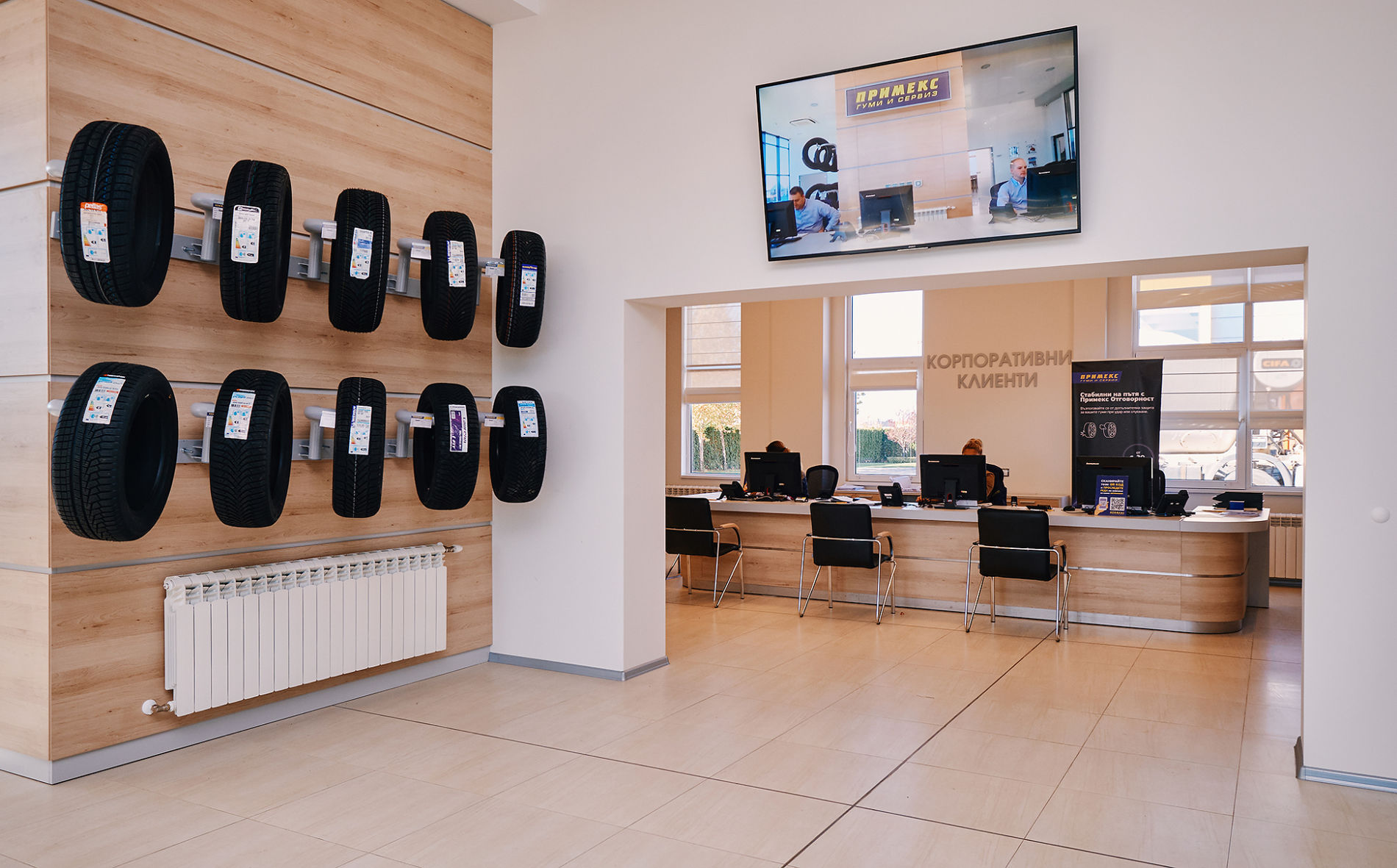 Изцяло нов дизайн има и кафе-зоната. Монитори излъчват видео-информация за промоционалните предложения на компанията, качествата на различните марки гуми, както и полезни съвети за шофиране в зимни условия, което прави изчакването по-приятно и пълноценно.