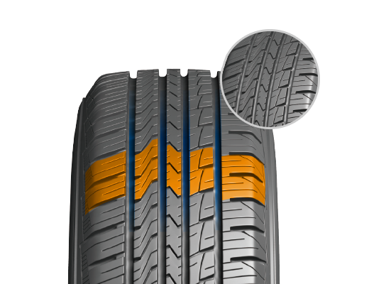 Вдлъбнатините на шарката на протектора, вградени в короната, са проектирани за ефективно източване на водата и предлагат голямо сцепление на мокри пътища, за да подобрят цялостната безопасност.