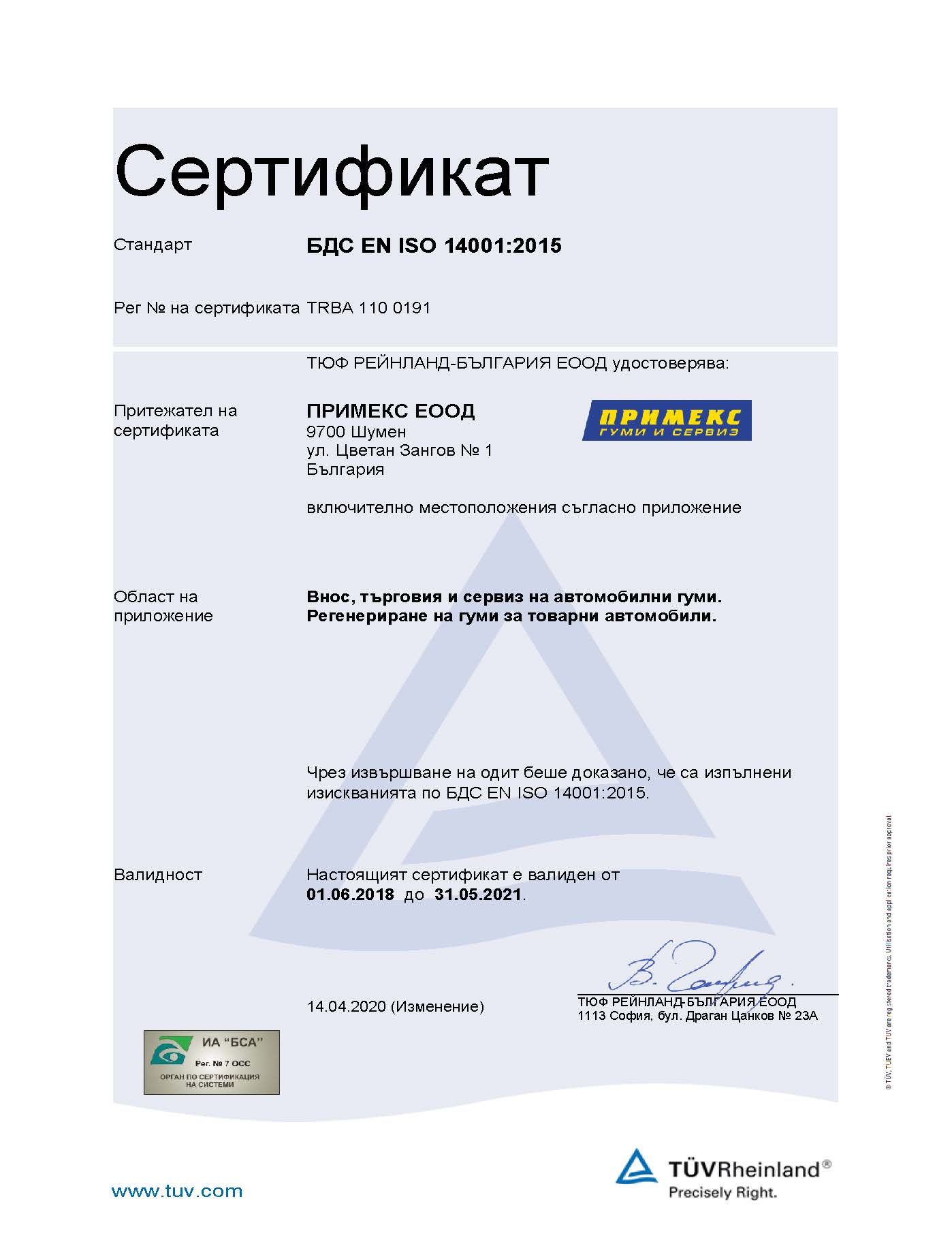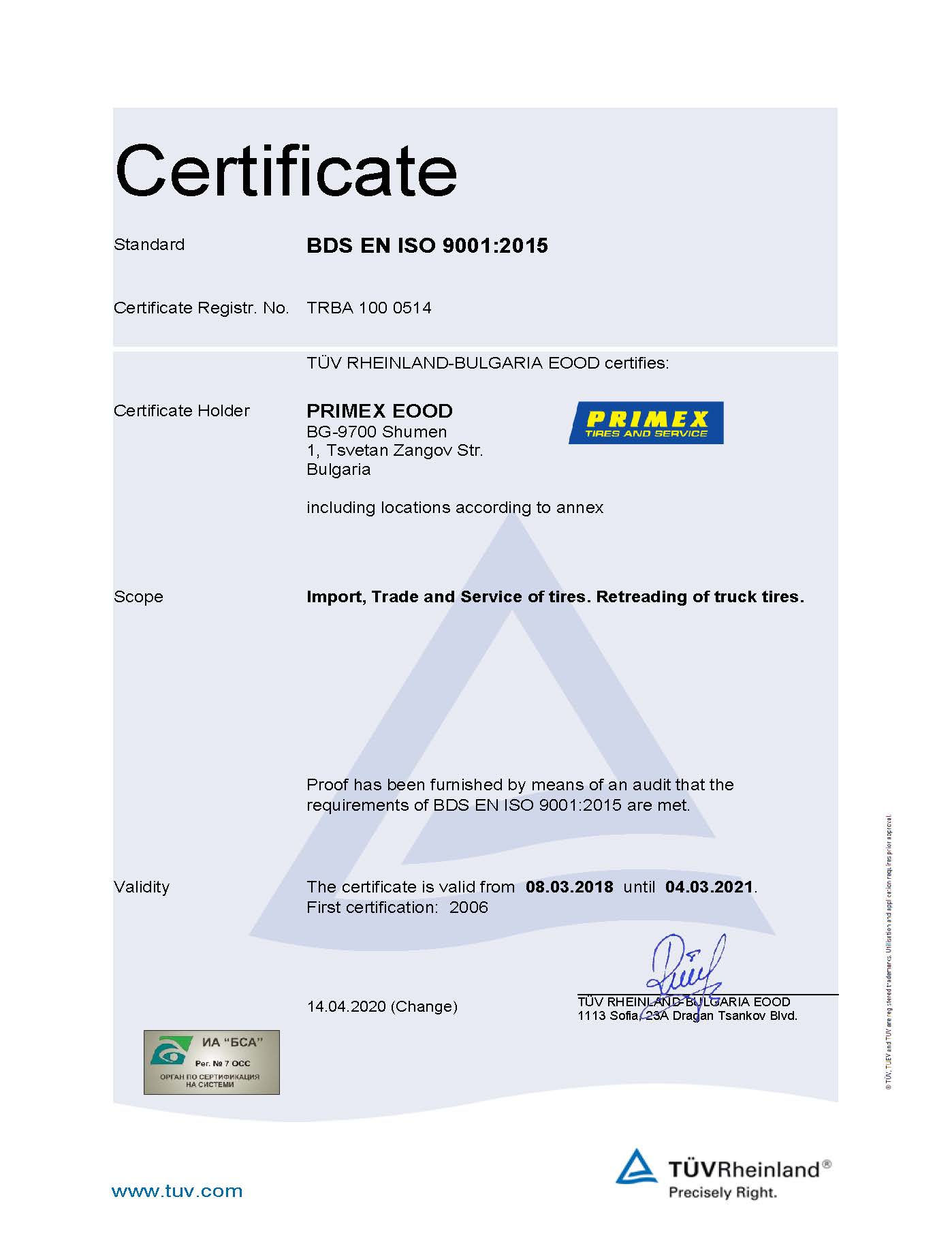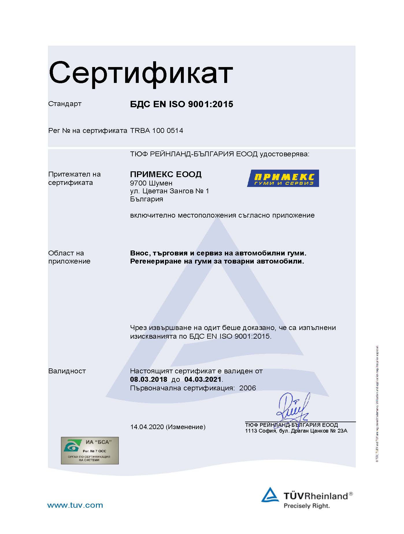 Примекс е удостоверена с международния сертификат по качество - ISO 9001:2015.