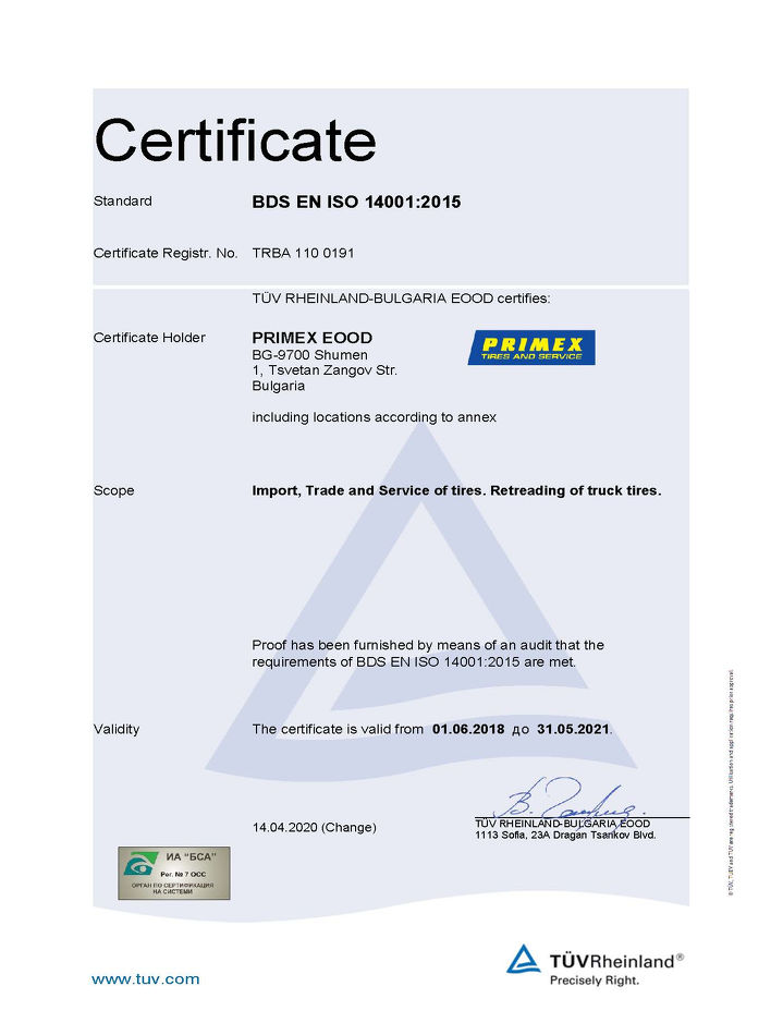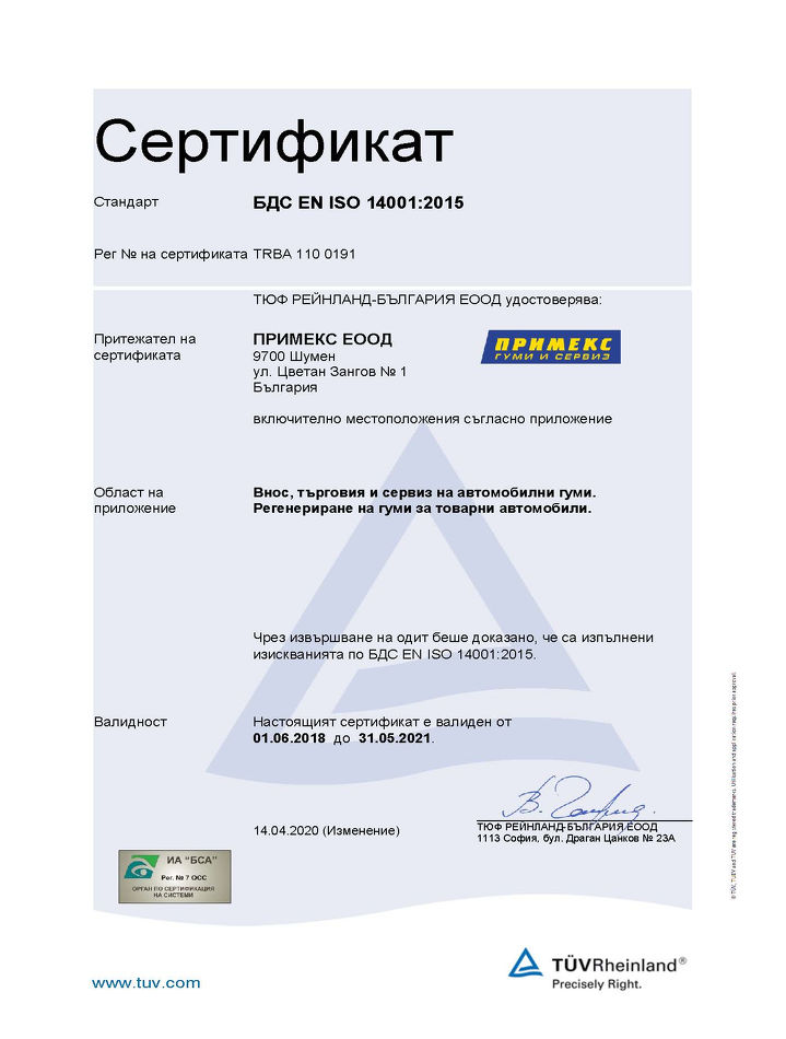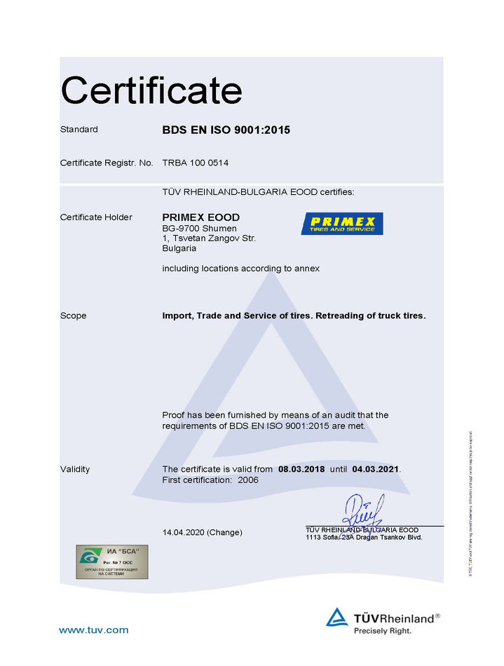 В компанията са сертифицирани всички основни дейности и направления: внос, търговия, сервиз и регенерат на автомобилни гуми. Системата за управление качество непрекъснато се подобрява в съответствие с изискванията на международния стандарт.
