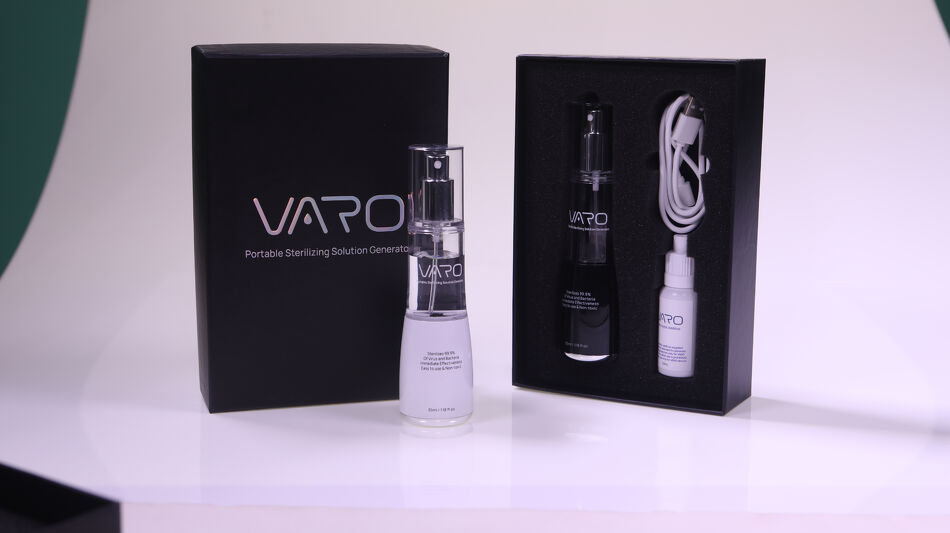Стерилизатор VARO, произведен от T&R Biofab Co. Екологично проектирано преносимо устройство за генериране на стерилизиращ разтвор (нетоксичен, убива до 99,999% от вирусите и бактериите)