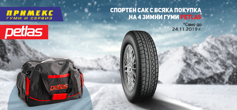 Купете 4 зимни гуми Petlas в центрове Примекс и ще получите на място подарък – брандиран спортен сак с отделение за обувки.